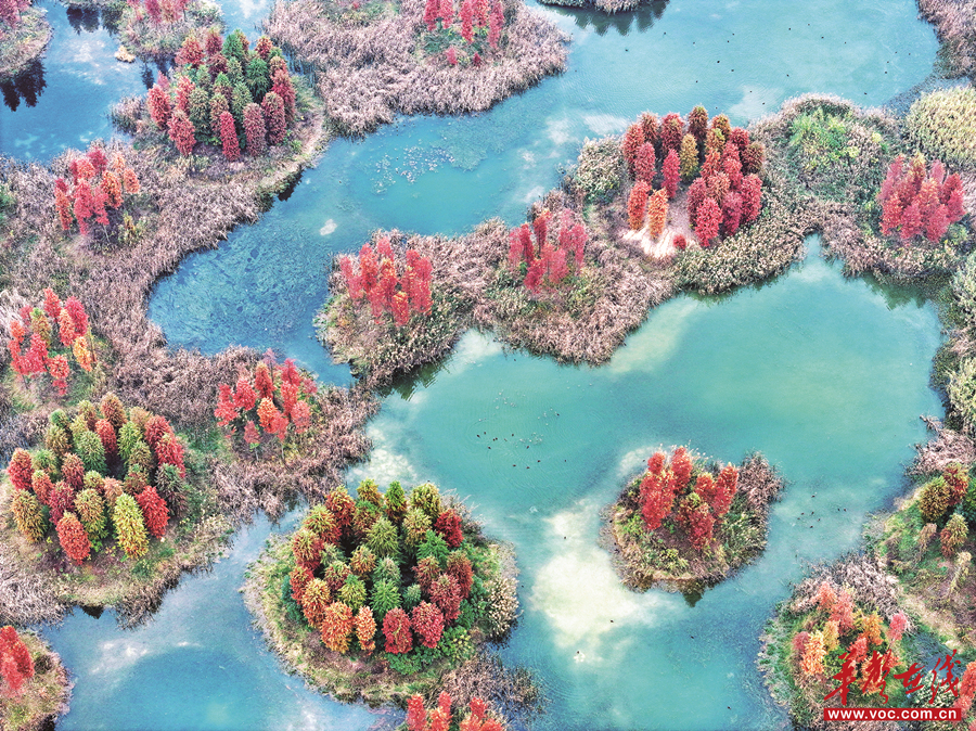 12月7日,大雪節氣,長沙市大澤湖近自然濕地公園圓形樹島上的水杉樹葉大多已變成紅色,成為冬日里一道亮麗的風景線。這些水杉林與濕地景觀融為一體,吸引市民紛紛前來觀光打卡。