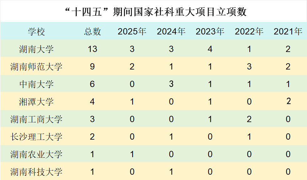 國家社科基金重大項(xiàng)目是我國哲學(xué)社會(huì)科學(xué)領(lǐng)域資助力度最大、層次最高、權(quán)威性最強(qiáng)的項(xiàng)目類別,代表了人文社會(huì)科學(xué)研究的國家最高水準(zhǔn)。對(duì)于高校而言,不僅僅是真金白銀的資助,更是衡量高?!半p一流”建設(shè)的重要指標(biāo)。記者了解到,“十四五”期間,湖南高校共獲得39項(xiàng)國家社科基金重大項(xiàng)目立項(xiàng),其中,湖南大學(xué)立項(xiàng)數(shù)量最多,共13項(xiàng),湖南師范大學(xué)獲9項(xiàng),中南大學(xué)獲6項(xiàng)。