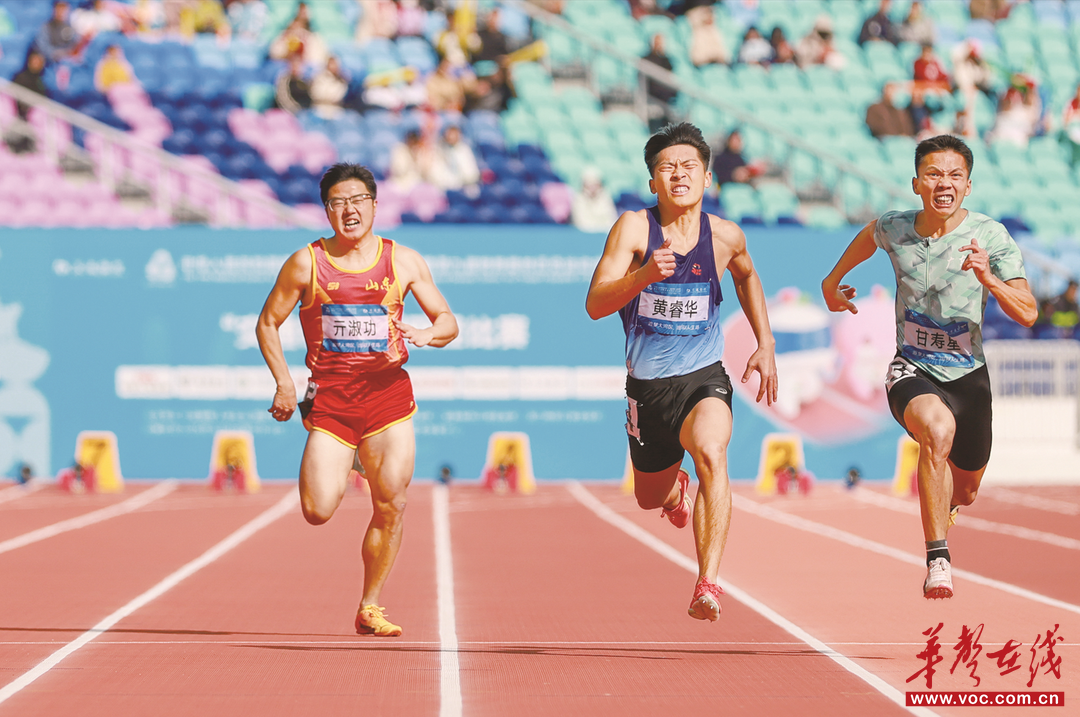 12月14日,黃睿華(中)在田徑男子100米T44級(jí)比賽中奮勇爭(zhēng)先,最終獲得銀牌。