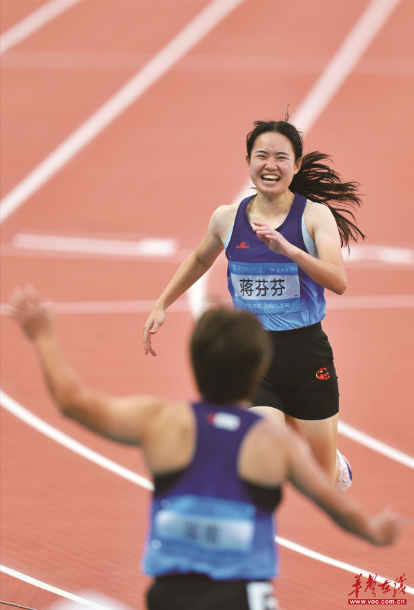 12月12日,在田徑女子4×100米T35-38級(jí)比賽中,湖南代表隊(duì)獲得金牌。圖為完賽后蔣芬芬與周霞一同慶祝。