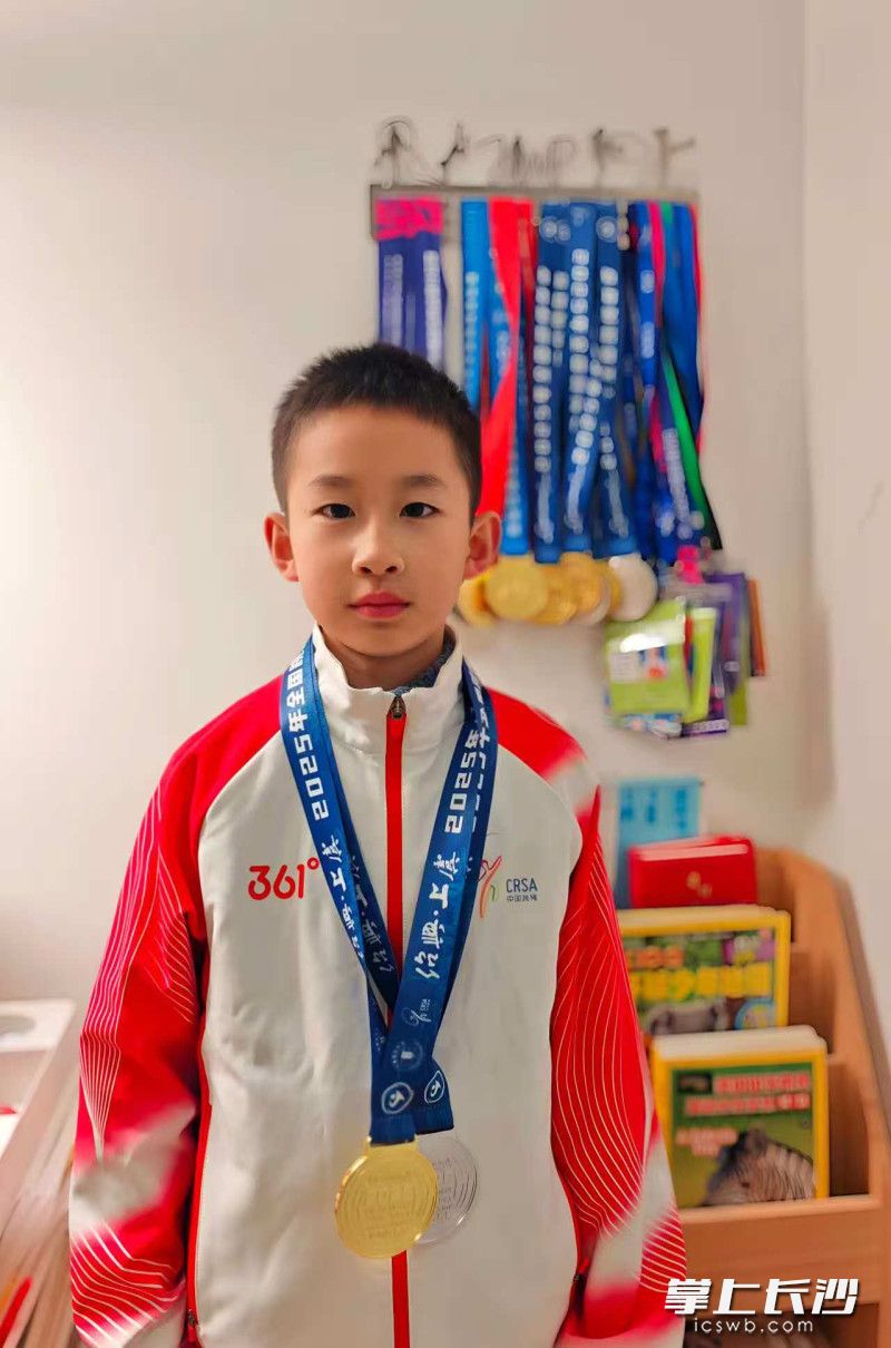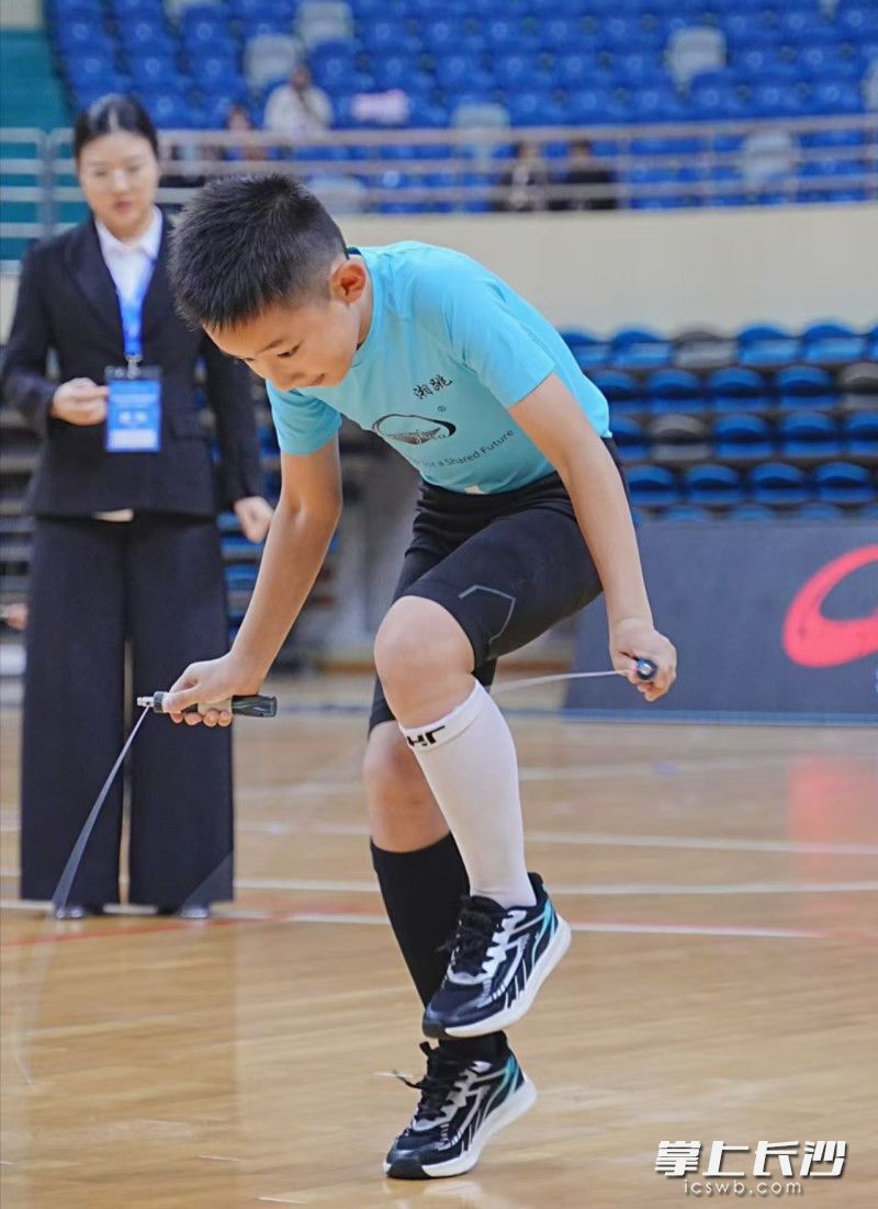 今年10歲的黃思行瘦小的身影在晨光中躍動,雙腳交替如閃電,跳繩在空中化作一道道光芒。這位來自望城區長郡月亮島學校的五年級學生,剛剛在全國跳繩錦標賽上斬獲U11男子組30秒單搖跳金牌、3分鐘單搖跳銀牌,并自動獲得國家集訓隊資格,有望代表國家隊參加2026年亞洲跳繩錦標賽。