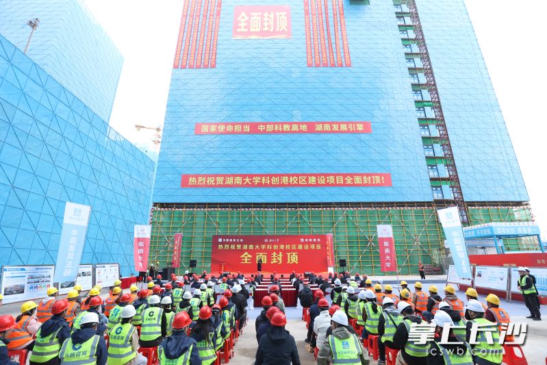 12月16日,湖南大學科創港校區建設項目三標段順利完成主體封頂。 均為長沙晚報通訊員康佳供圖